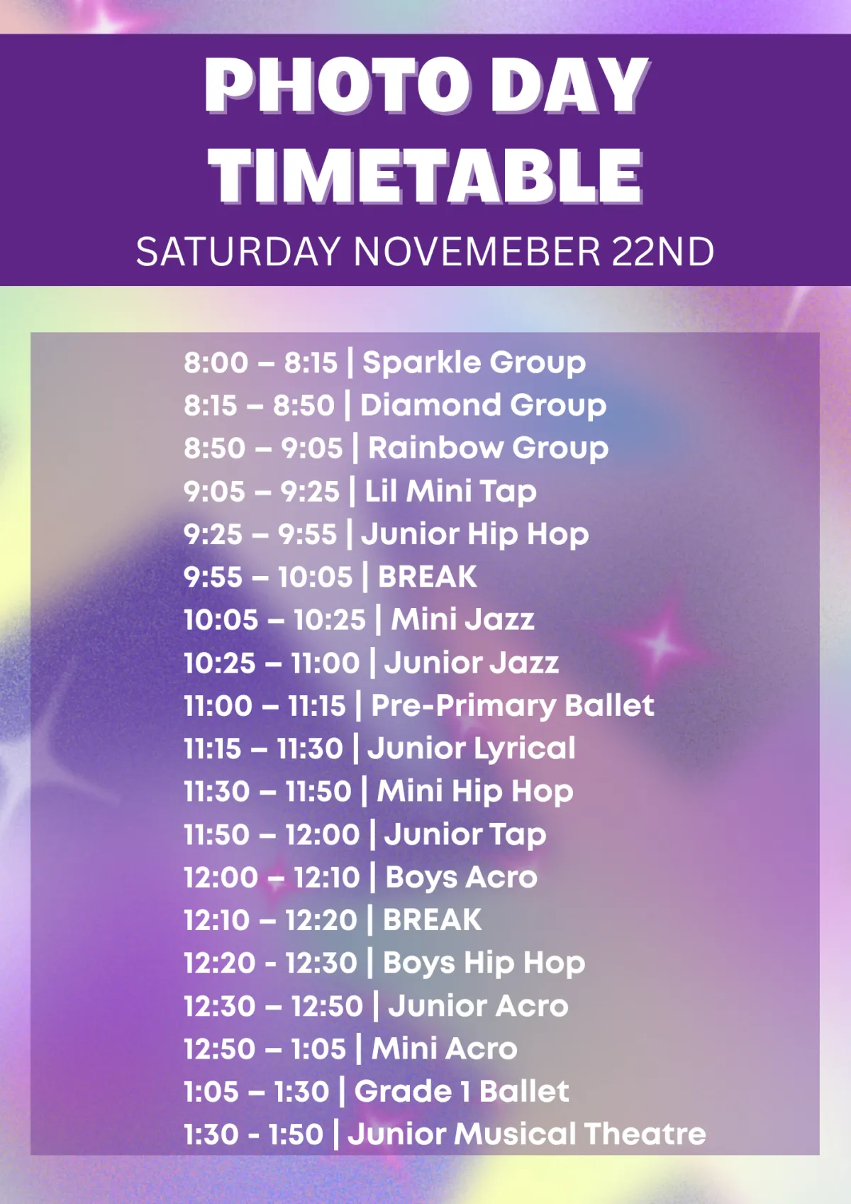 See Photo Day Timetable Below