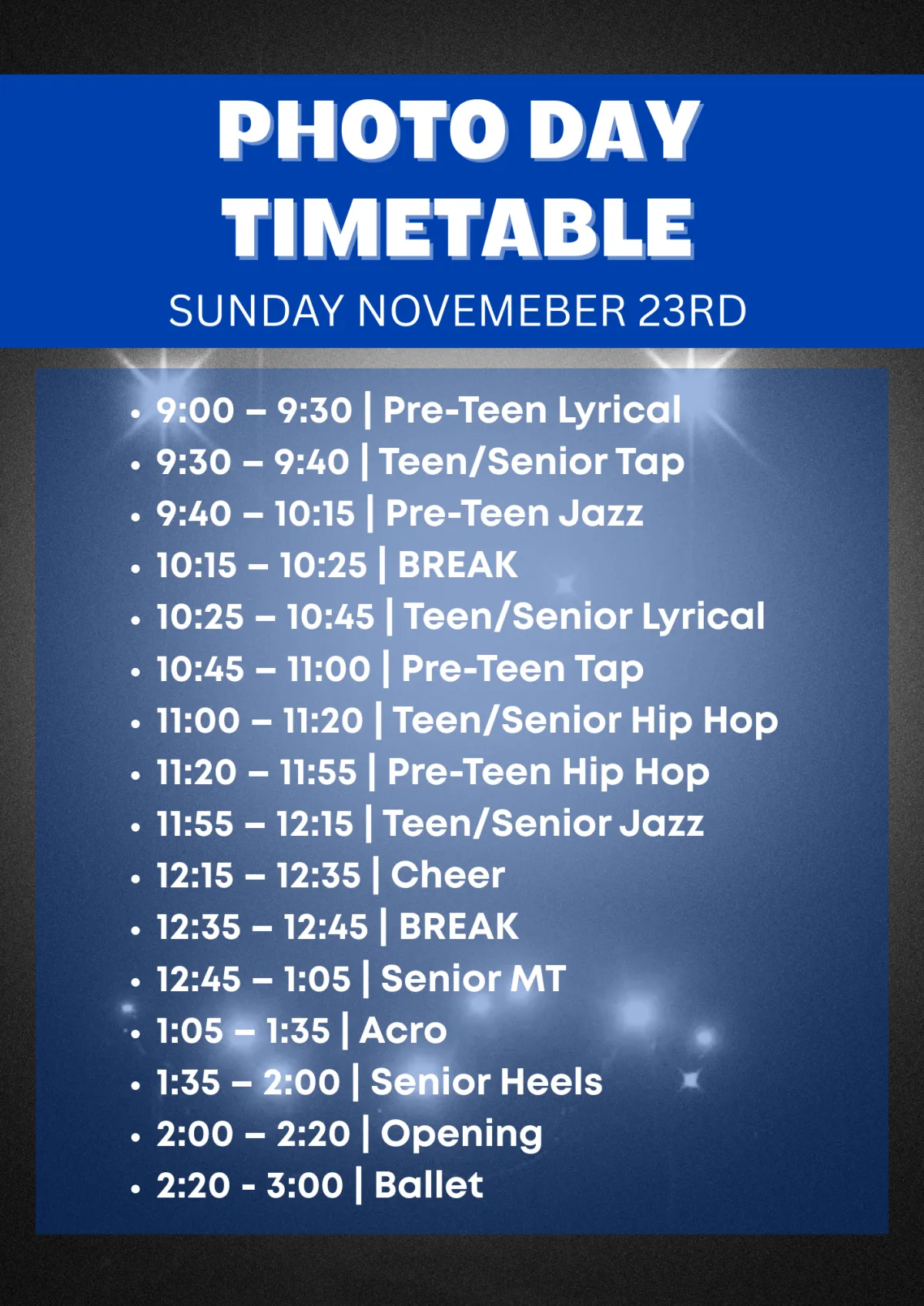 Our photographer will be capturing each class and individual dancer during Photo Day.